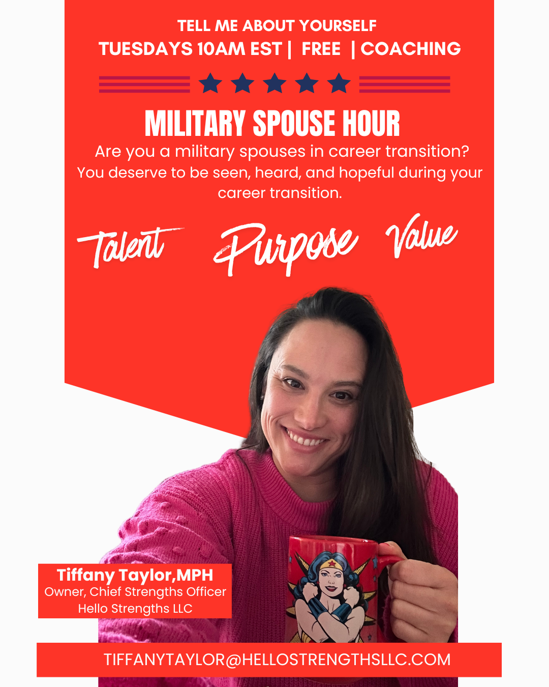 If you are a military spouse, sign up for Military Spouse Hour and join me to talk about your talents, passions, and navigating your career transition.